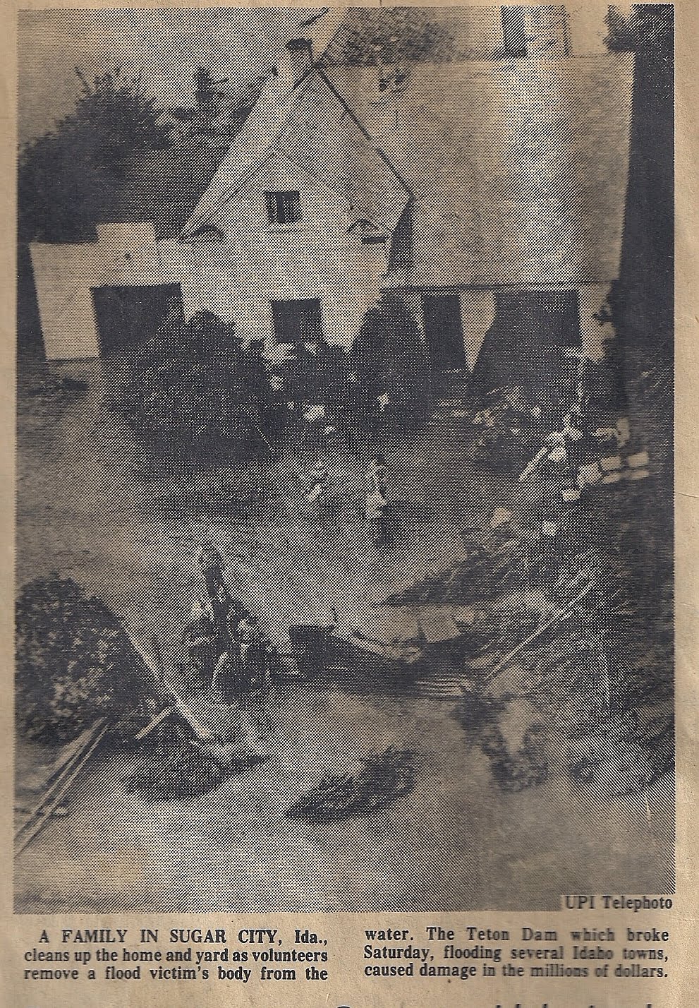 This is the view from the helicopter as the family carried out the deceased victim. It says, “A family in Sugar City, Idaho, cleans up the home and yard as volunteers remove a flood victim’s body from the water. The Teton Dam which broke Saturday, flooding several Idaho towns, caused damage in the millions of dollars.” It should be noted the family was the volunteer group.